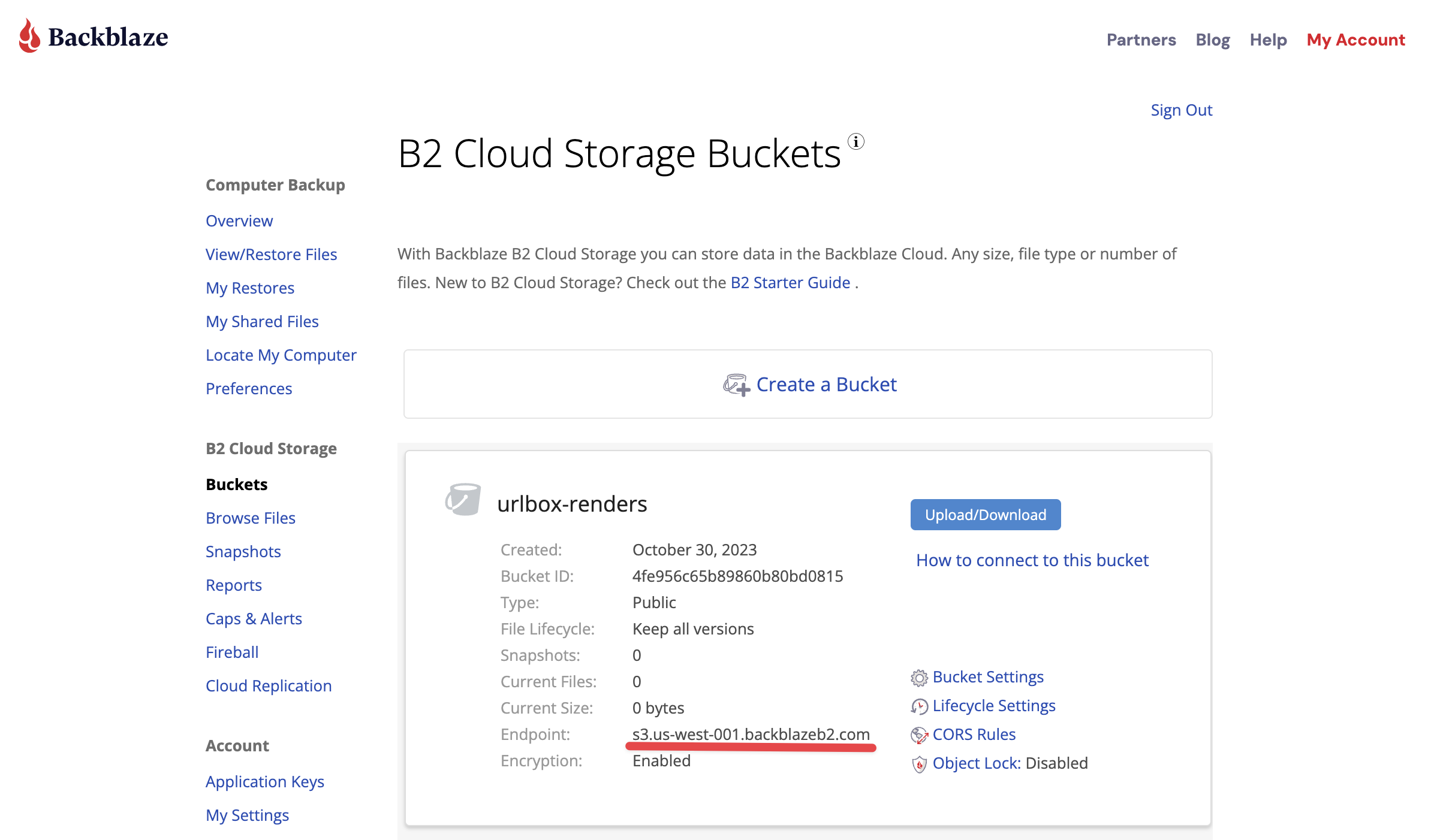 Endpoint URL For the endpoint URL we can go to our bucket page and see what endpoint we have been assigned: