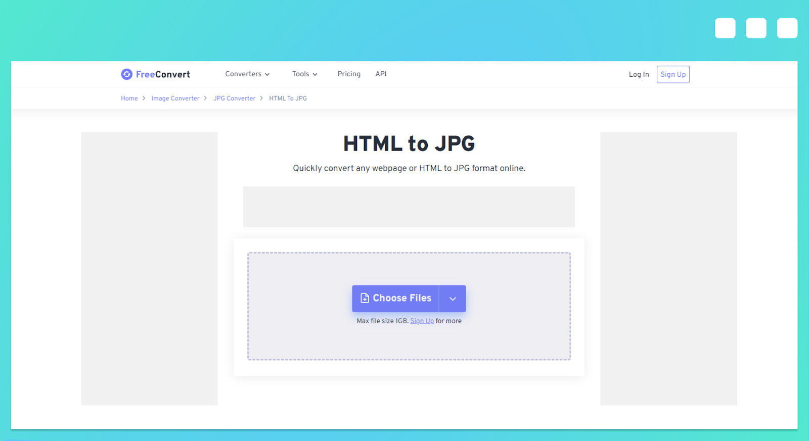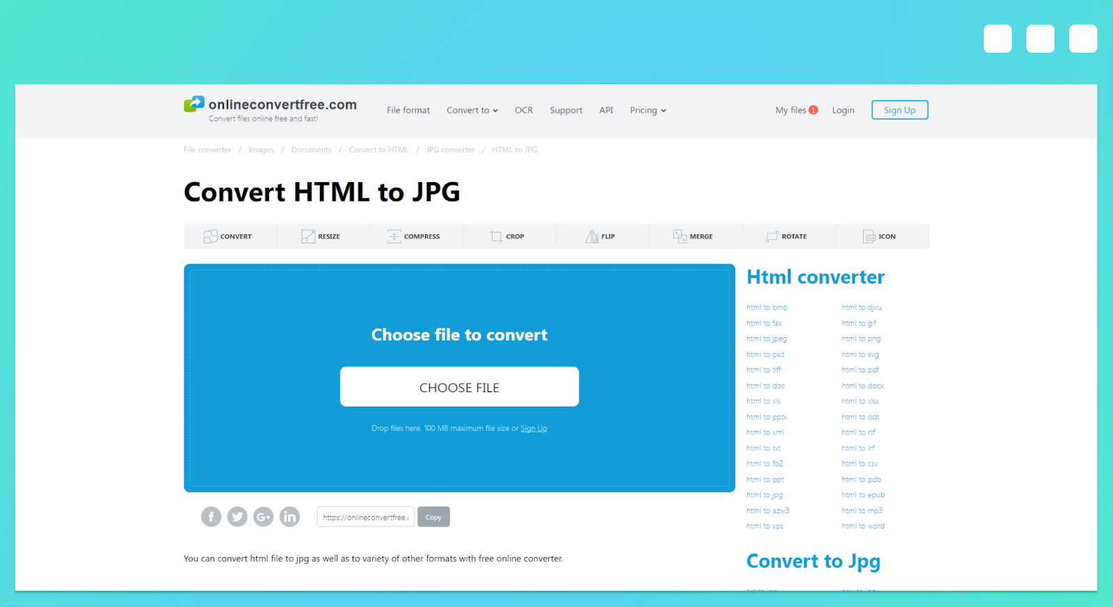 Free Convert is a complete suite of conversion tools that can also turn HTML code or files into JPG images. You can upload your document from your computer, Dropbox, Google Drive, or simply add the URL of the page you want to screenshot.