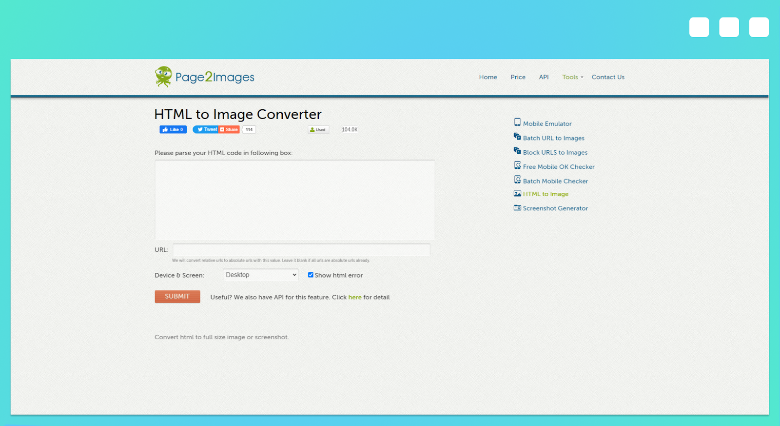 Page2Images is a free online file converter that can quickly generate an image from HTML code or via a URL. Unfortunately, you can't upload a file directly, so you will have to open your HTML document with an editor and manually copy and paste the code into Page2Images' website.