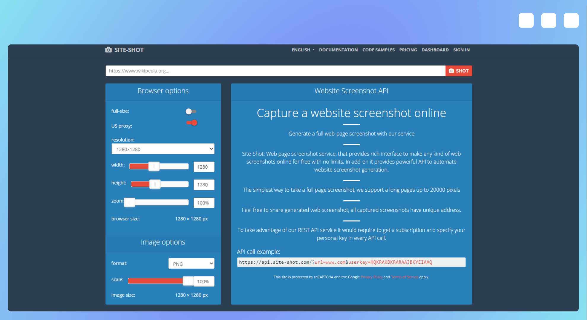 Site-shot is a web-based tool that captures website screenshots of multiple URLs in bulk using an API. To use their API, you need to specify your unique API key, which you can get after the signup process in the Dashboard. You can also specify multiple request header fields and proxy servers.