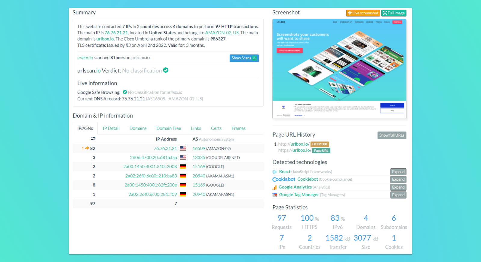 The service detects the technologies used by the website you scan and provides basic page statistics, like the number of requests, the number of 3rd party cookies, and the domains/subdomains they are generated by.