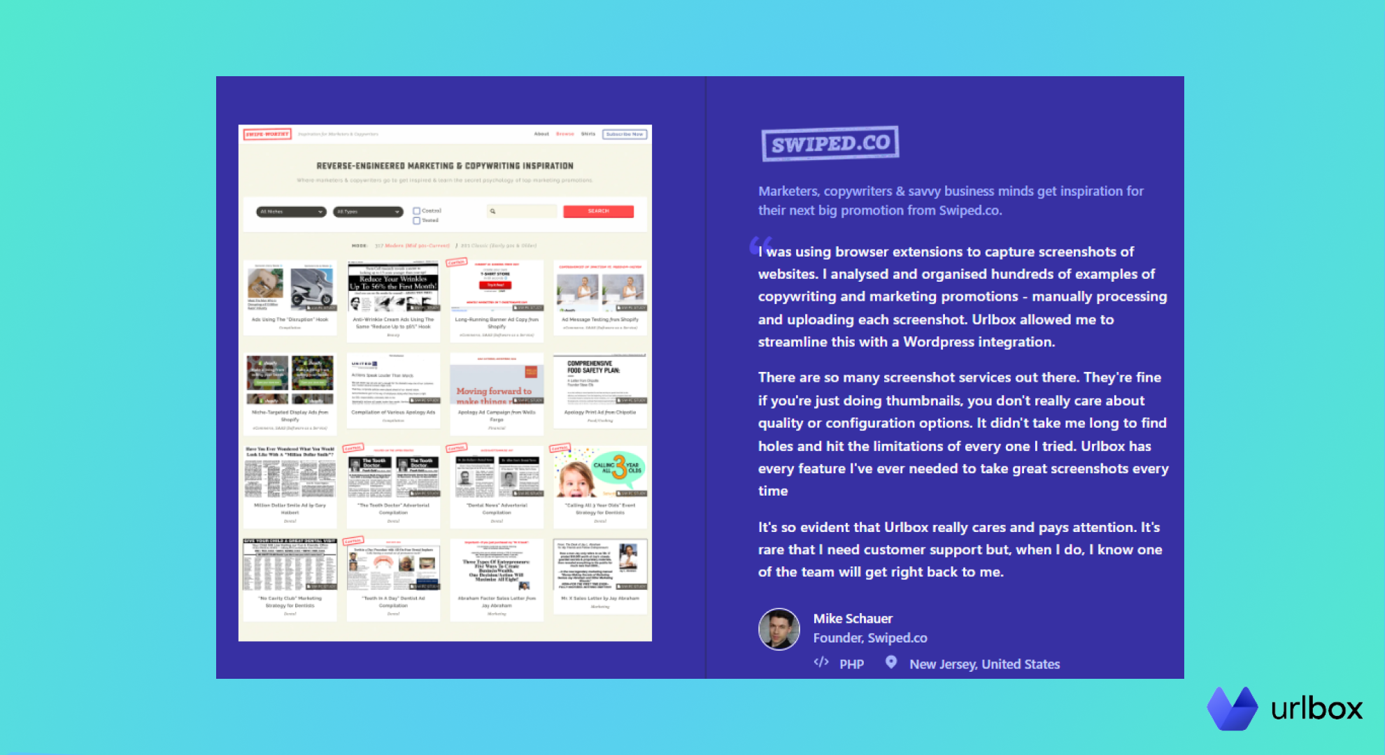 For example, Swiped.co uses Urlbox to create the web's biggest Swipe file.
