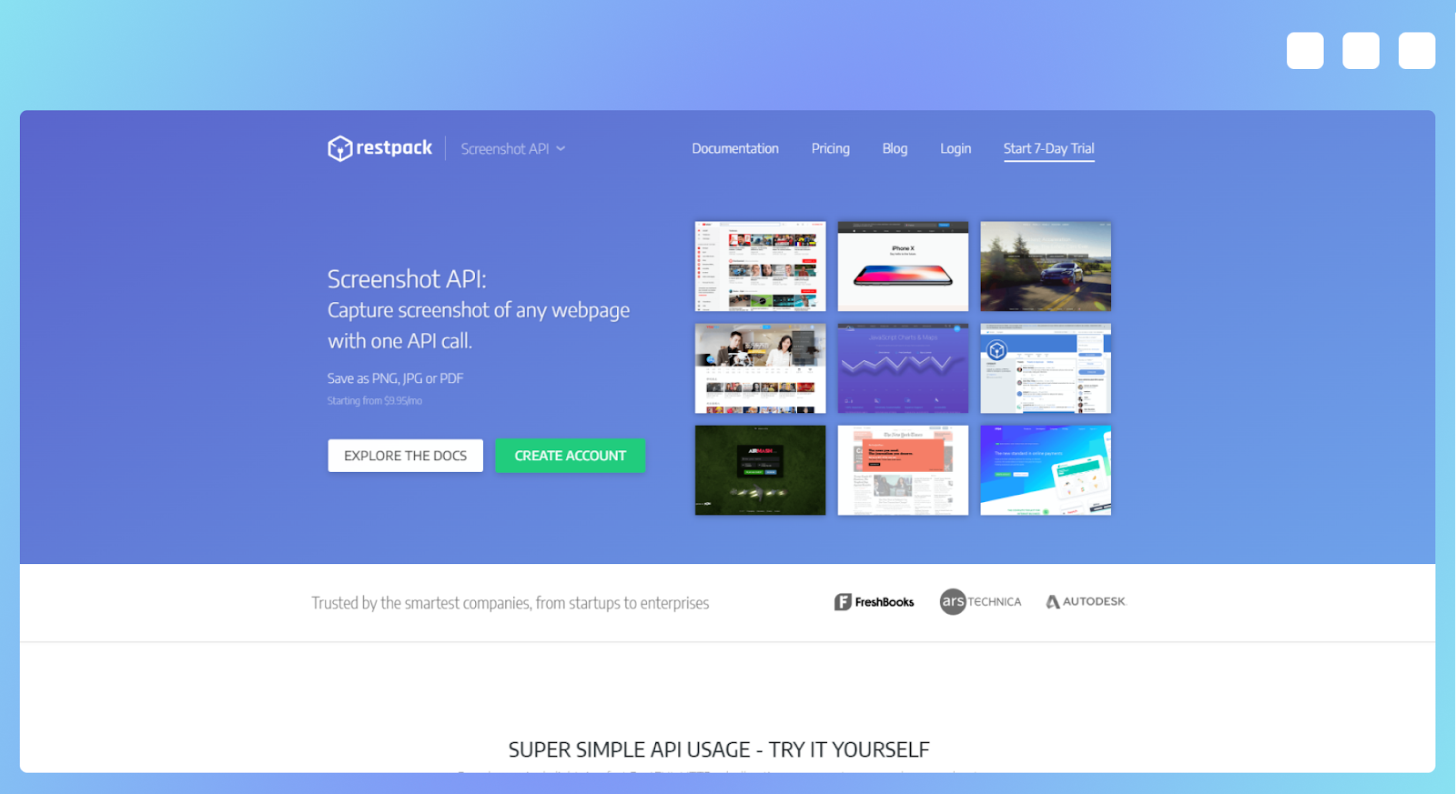 Restpack provides two APIs, one designed to capture screenshots of webpages while the other to convert HTML to PDF. Regardless of the one you plan to use, Restpack offers customizable viewport settings, the ability to capture specific page elements, and supports lazy loading images.