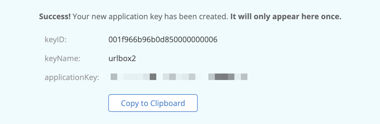 The keyId is the access key and the applicationKey will be the secret key that we feed to Urlbox in the next step, so make sure to copy them somewhere safe.