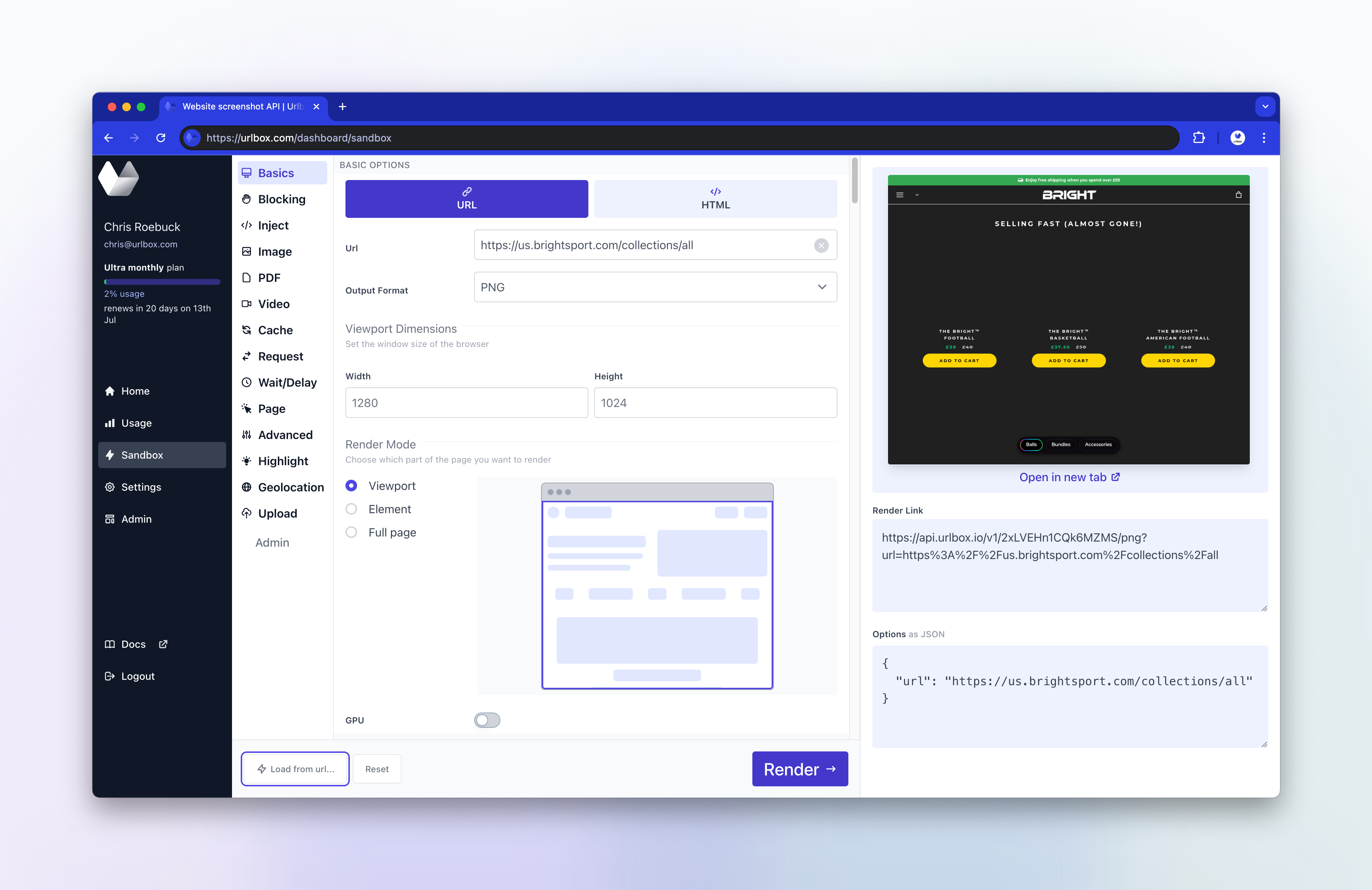 We'll try to run the request without any additional options to see if the issue still occurs. We can use our own developer sandbox to quickly load and run the screenshot request without any render options: