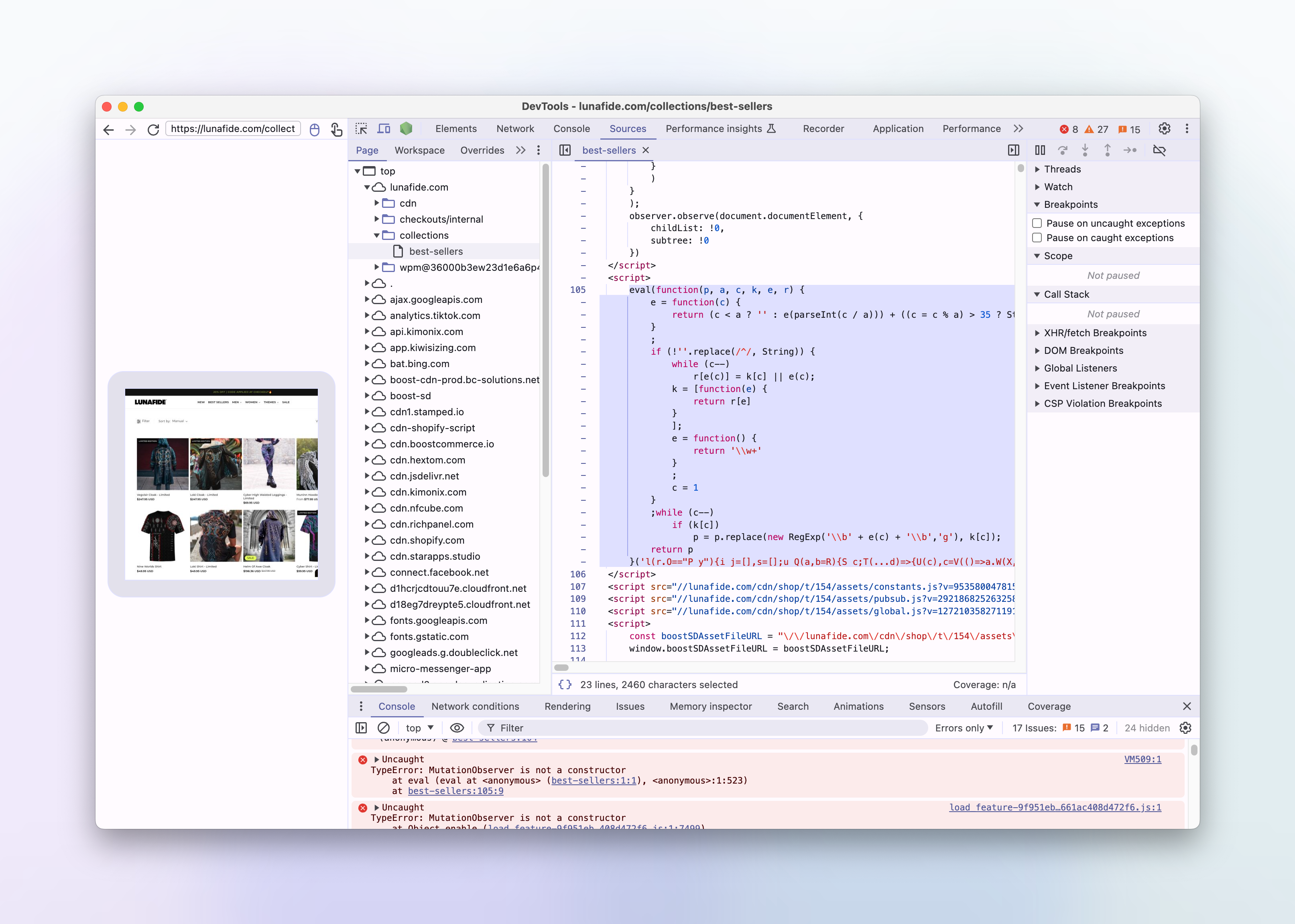 }('l(r.O=="P y"){i j=[],s=[];u Q(a,b=R){S c;T(...d)=>{U(c),c=V(()=>a.W(X,d),b)}}2.m="Y"+(2.z||"")+"Z";2.A="10"+(2.z||"")+"11";12{i a=r[2.m],e=r[2.A];2.k=(e.B(\'y\')>-1&&a.B(\'13\')<0),2.m="!1",c=C}14(d){2.k=!1;i c=C;2.m="!1"}2.k=k;l(k)i v=D E(e=>{e.8(({F:e})=>{e.8(e=>{1===e.5&&"G"===e.6&&(e.4("n","o"),e.4("f-3",e.3),e.g("3")),1===e.5&&"H"===e.6&&++p>q&&e.4("n","o"),1===e.5&&"I"===e.6&&j.w&&j.8(t=>{e.7.h(t)&&(e.4("f-7",e.7),e.g("7"))}),1===e.5&&"J"===e.6&&(e.4("f-3",e.3),e.g("3"),e.15="16/17")})})}),p=0,q=K;18 i v=D E(e=>{e.8(({F:e})=>{e.8(e=>{1===e.5&&"G"===e.6&&(e.4("n","o"),e.4("f-3",e.3),e.g("3")),1===e.5&&"H"===e.6&&++p>q&&e.4("n","o"),1===e.5&&"I"===e.6&&j.w&&j.8(t=>{e.7.h(t)&&(e.4("f-7",e.7),e.g("7"))}),1===e.5&&"J"===e.6&&(s.w&&s.8(t=>{e.3.h(t)&&(e.4("f-3",e.3),e.g("3"))}),e.9.h("x")&&(e.9=e.9.L("l(2.M)","N.19(\'1a\',u(1b){x();});l(2.M)").1c(", x",", u(){}")),(e.9.h("1d")||e.9.h("1e"))&&(e.9=e.9.L("1f","1g")))})})}),p=0,q=K;v.1h(N.1i,{1j:!0,1k:!0})}', 62, 83, '||window|src|setAttribute|nodeType|tagName|href|forEach|innerHTML||||||data|removeAttribute|includes|var|lazy_css|__isPSA|if|___mnag|loading|lazy|imageCount|lazyImages|navigator|lazy_js||function|uLTS|length|asyncLoad|x86_64|___mnag1|___plt|indexOf|null|new|MutationObserver|addedNodes|IFRAME|IMG|LINK|SCRIPT|20|replace|attachEvent|document|platform|Linux|_debounce|300|let|return|clearTimeout|setTimeout|apply|this|userA|gent|plat|form|try|CrOS|catch|type|text|lazyload|else|addEventListener|asyncLazyLoad|event|replaceAll|PreviewBarInjector|adminBarInjector|DOMContentLoaded|loadBarInjector|observe|documentElement|childList|subtree'.split('|'), 0, {}))This is clearly a very obfuscated script which when run will evaluate into the slightly less obfuscated script from above.