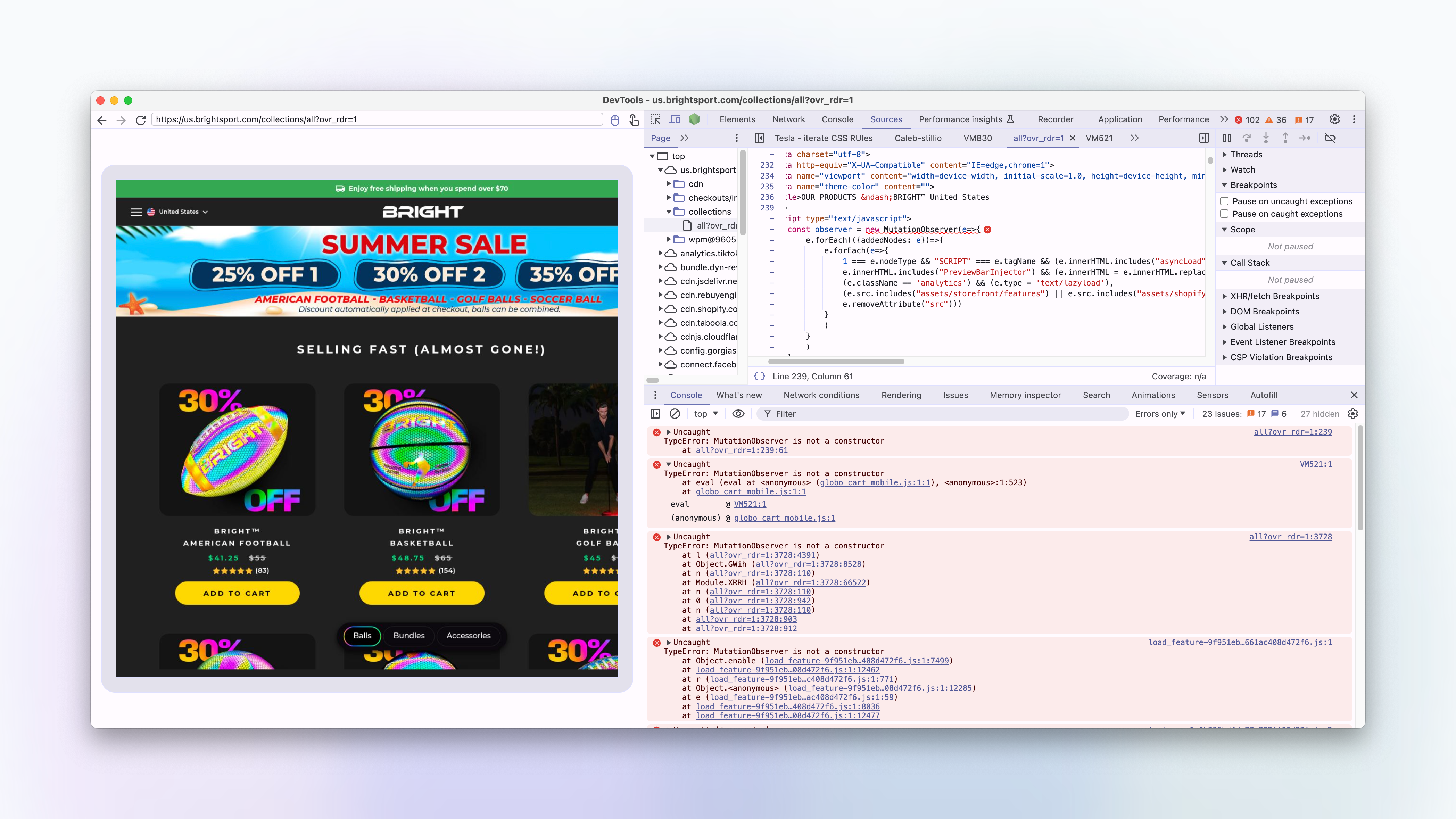 We used a combination of local development, remote debugging in a production-like environment, and inspecting the source of the website to find the root cause of the issue, which was caused by a rogue shopify plugin disabling scripts from loading if the browsers host platform was linux based.
