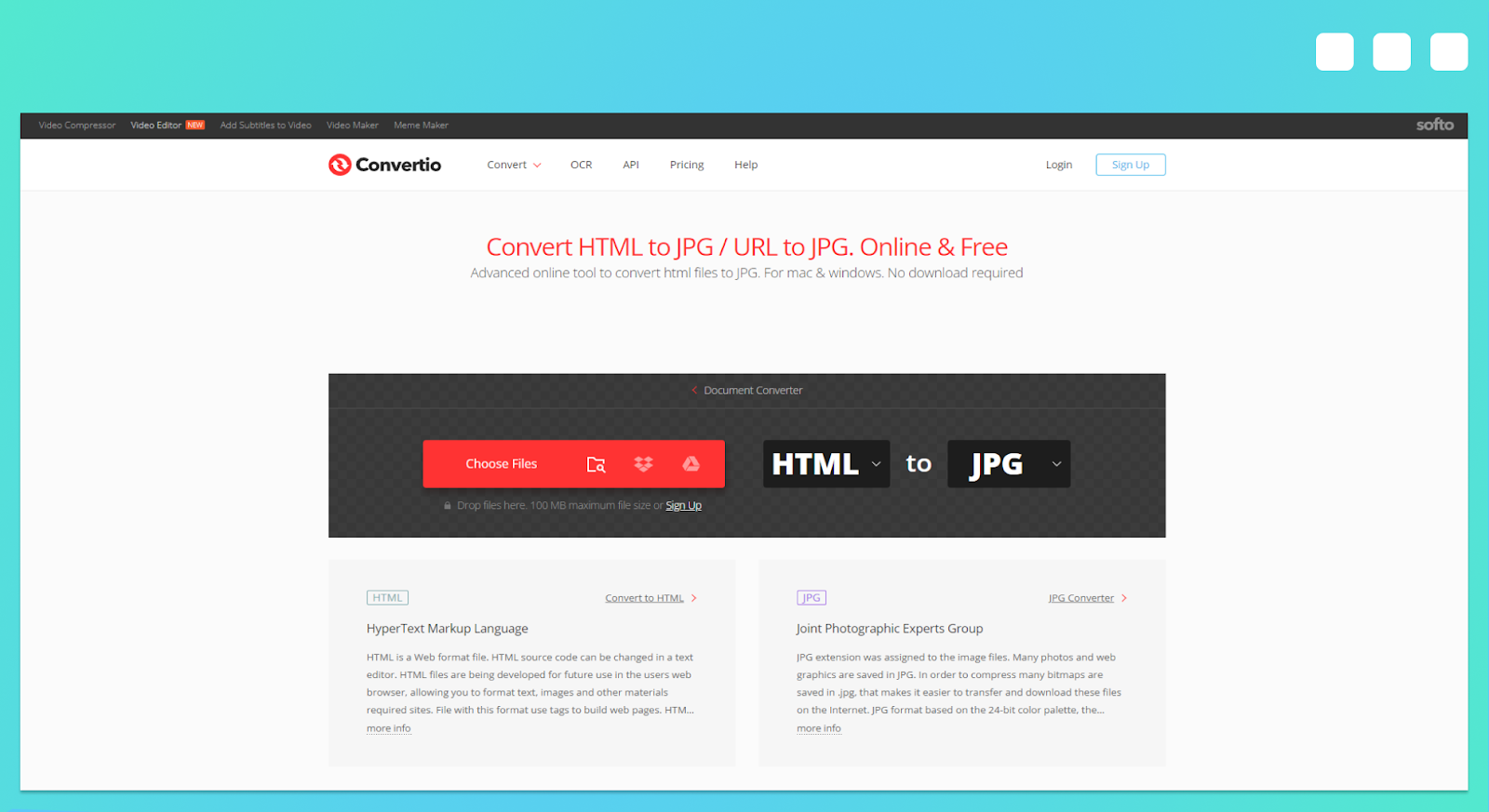 Convertio is an all-in-one online converter that can turn HTML files into images. The free plan allows you to upload any file (smaller than 100 MB) from various sources, like your computer, Dropbox, or Google Drive, and then automatically convert it into a JPG, PNG, GIF, SVG, or another format.