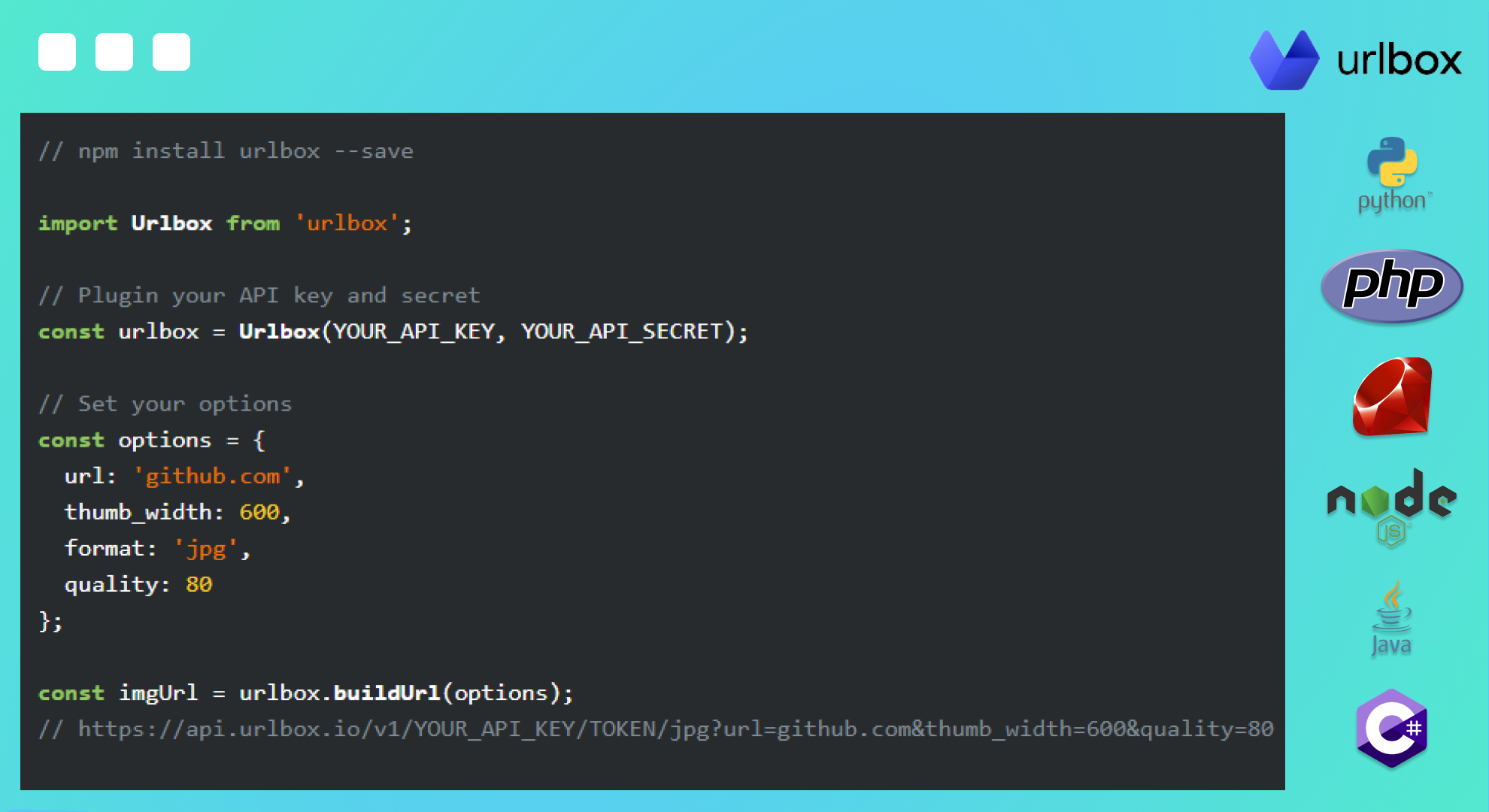 The best part about Urlbox is that it can be implemented in a few minutes regardless of your stack. Here are some examples: