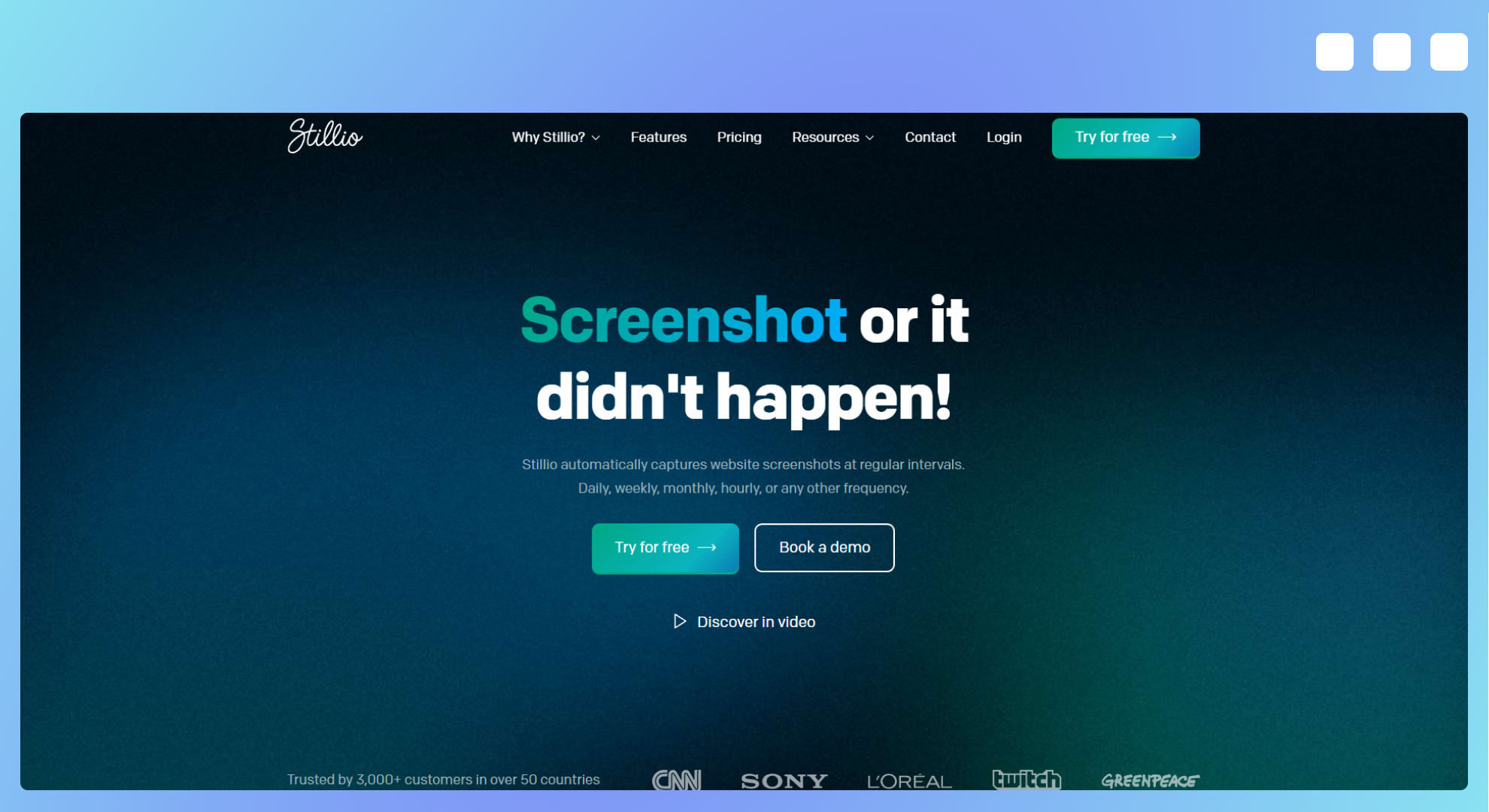 Stillio helps you capture, archive, and share screenshots via automated workflows. You can configure everything from a single dashboard and store the SERP screenshots in the software. Moreover, you can customize the capture interval (e.g., hourly, daily, weekly, etc.) and integrate the software with third-party services like Google Drive, Dropbox, etc., to sync files across platforms.