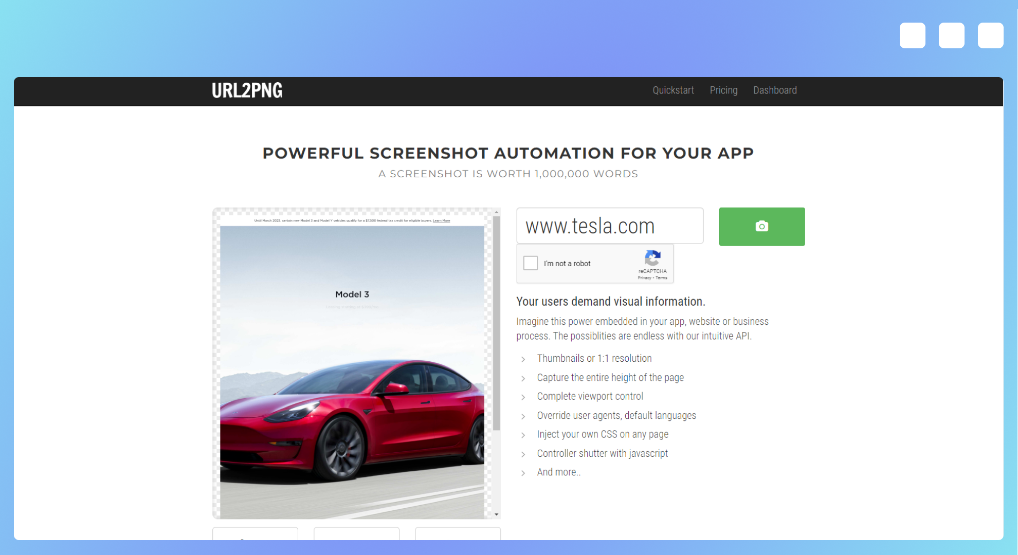 URL2PNG provides a powerful API you can use to capture multiple screenshots. Here are some of its pros: