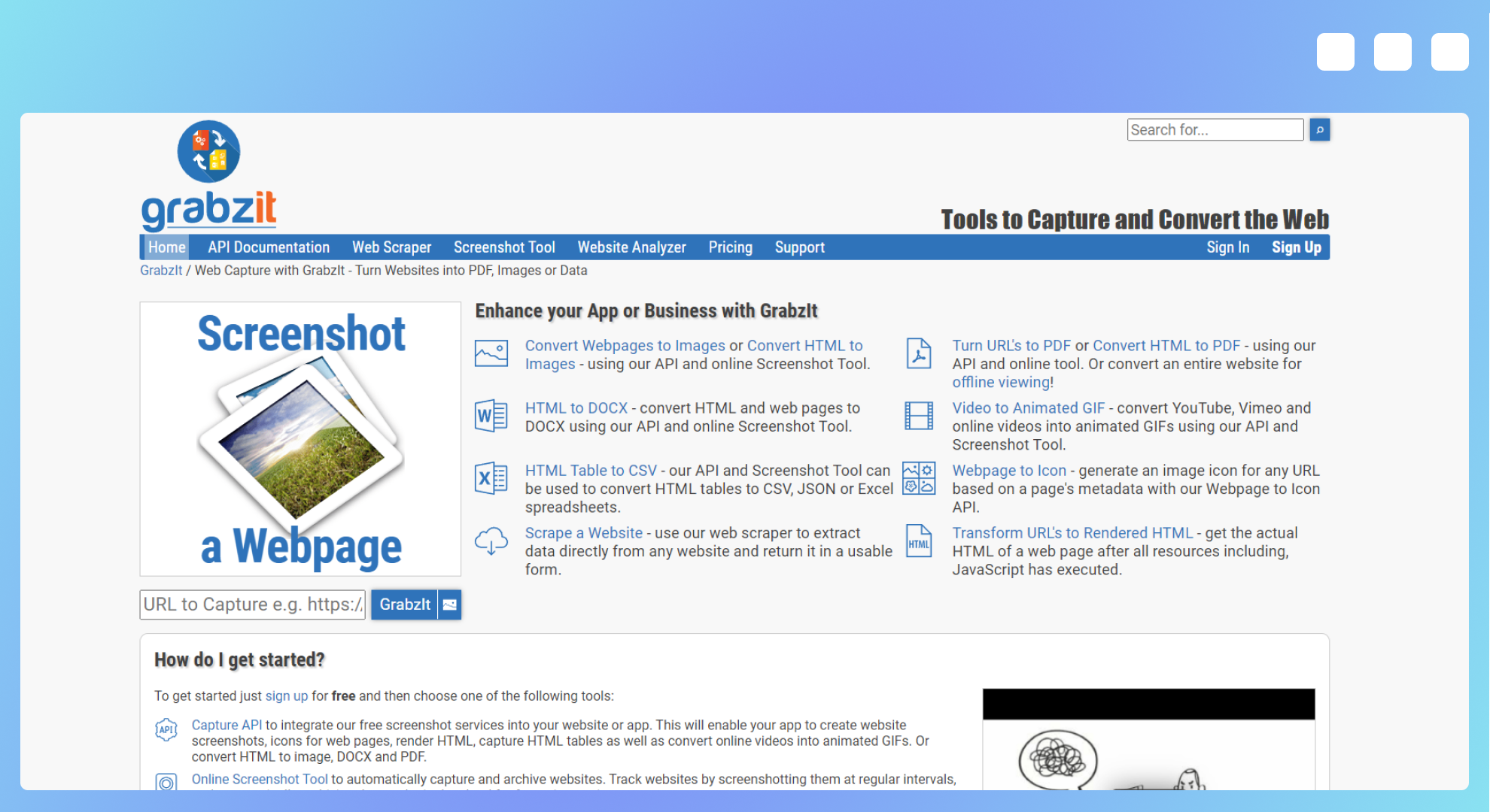 Grabzit is an online service that allows users to take screenshots of websites and convert HTML to PDF documents or image files. The service provides a simple API that developers can use to capture screenshots programmatically from their applications.
