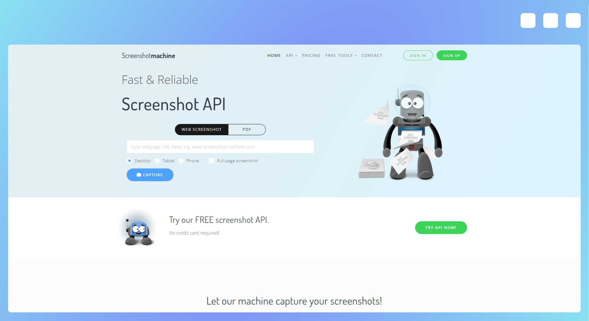 Screenshotmachine allows developers to capture high-resolution screenshots of websites in a matter of minutes. It provides an online interface and two APIs you can use to automatically convert any web page to a PNG, JPEG, or GIF image or any URL into a PDF document.