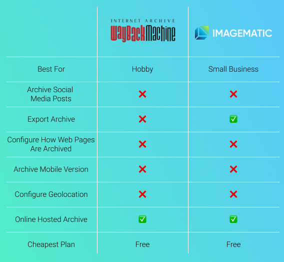 You can start using Imagematic for free to capture a single URL daily. Their cheapest plan is $4.99 per month and lets you capture up to 60 images. This is great if you want to store weekly instances of up to 10 pages.