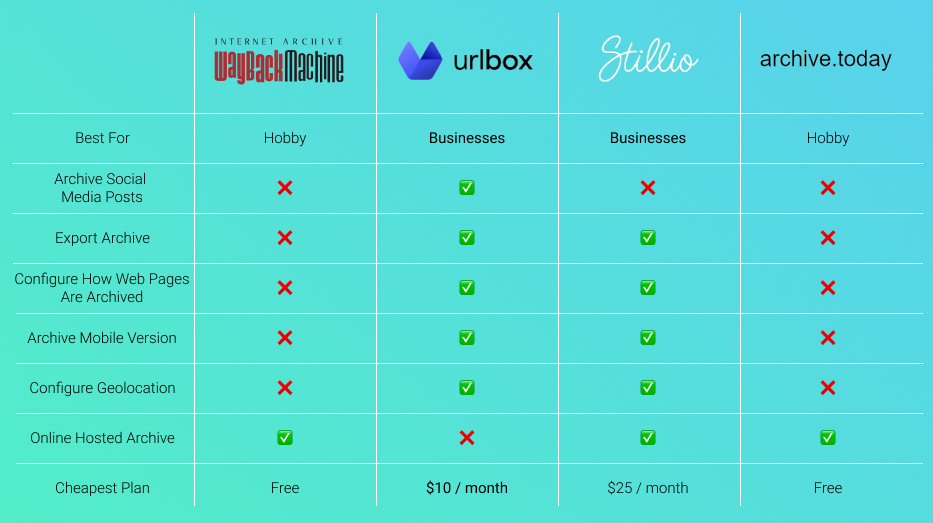 Urlbox is the most complete web archiving tool you can find online. Packed with all essential features, plus some more, Urlbox is by far the best in terms of cost versus functionality.