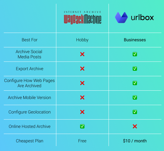 This makes Urlbox one of the best Wayback Machine alternatives for businesses looking to archive websites at scale.