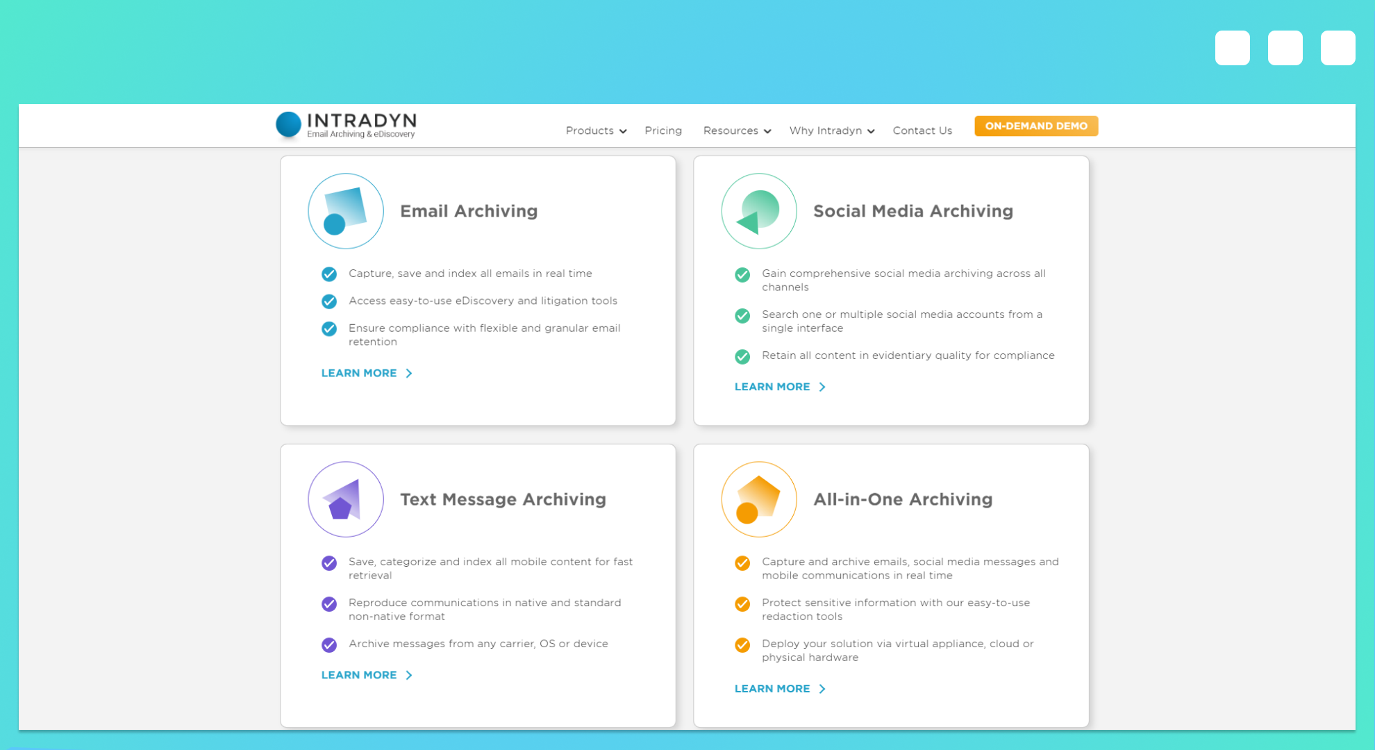 Intradyn was created to help businesses tackle regulatory compliance, eDiscovery, and litigation. It's comprised of 4 products that blend together: